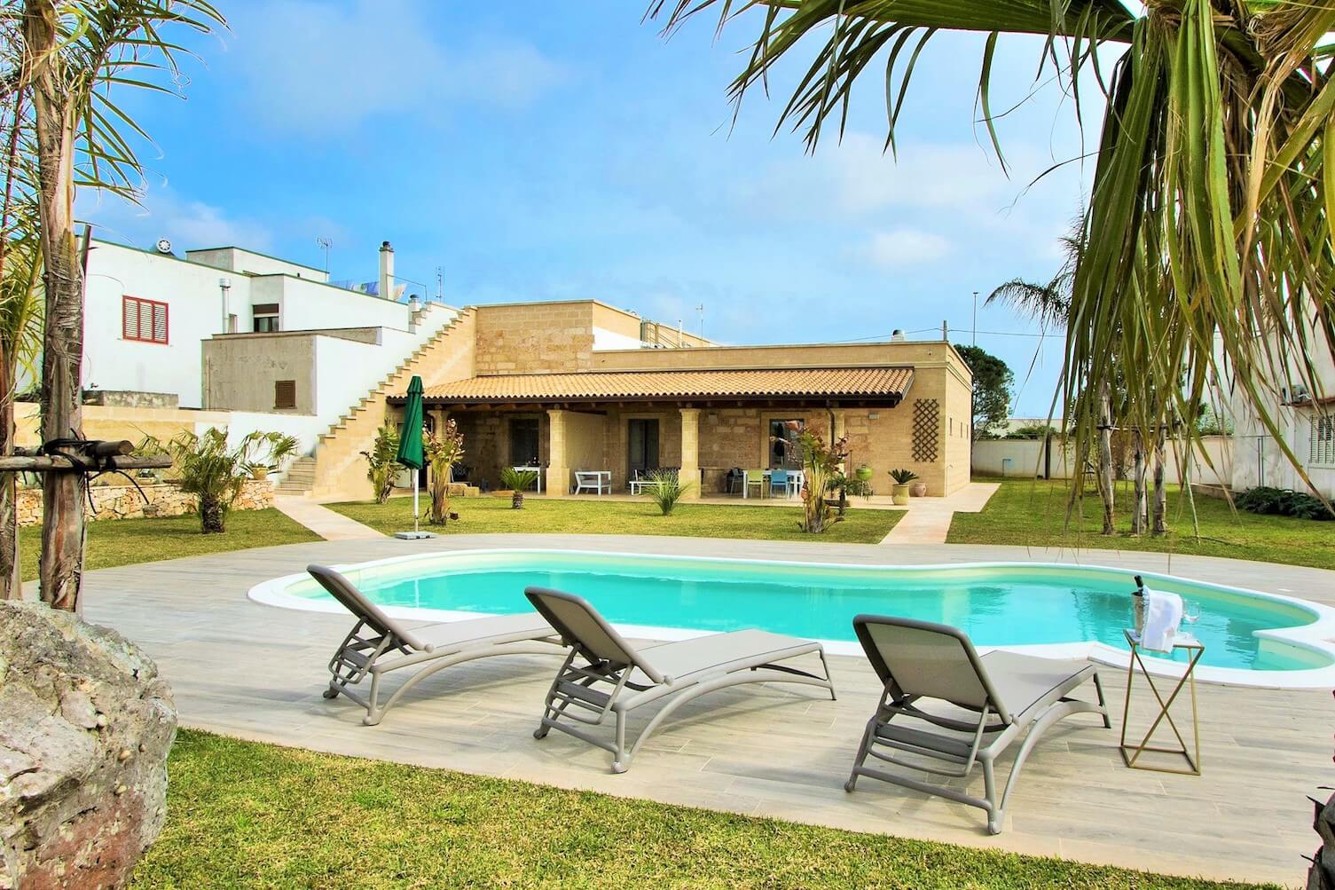 The villa is located in the center of a small southern Italian village. The absolute central location (5 km from the Adriatic Sea and 5 km from the Ionian Sea) is ideal for reaching all major attractions in a few minutes by car. On the east side are the most beautiful sandy beaches of Salent (Le Maldive del Salento). Eight kilometers away on the west side, the cliffs of Ponte Ciolo or the impressive caves of Le Tre Porte.